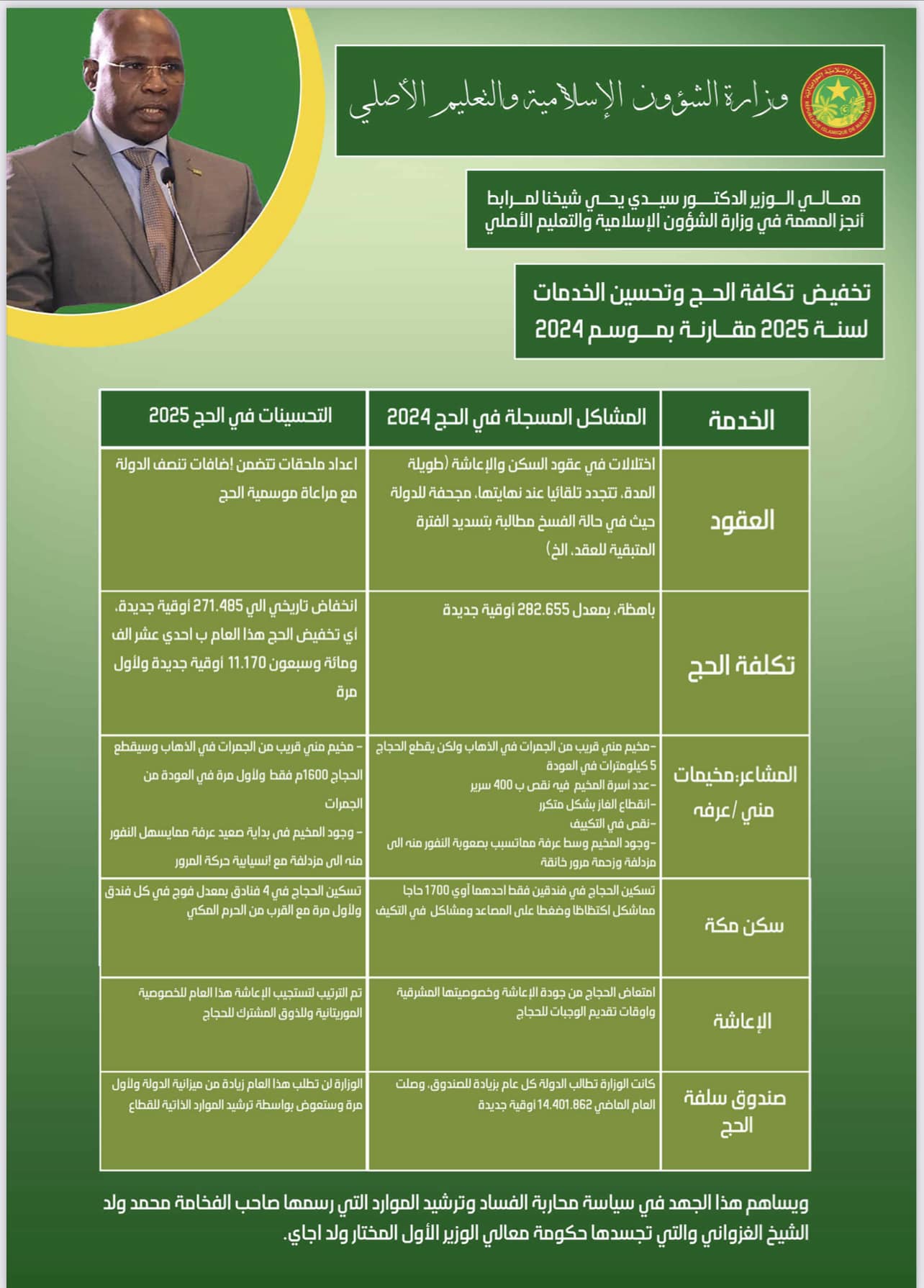 يظهر الجدول المرفق حجم الانجاز الكبير الذي حققه وزير الشؤون الاسلامية الدكتور سيدي يحي شيخنا لمرابط ليس فقط في خفض تكاليف الحج لدي المواطنين الموريتانيين وانما اضافة خدمات متميزة لم تكن موجودة في السابق رغم التكلفة الباهظة تتمثل في قرب مقر اقامة الحجاج الموريتانيين من الحرم المكي والمسجد النبوي ما سيساهم ف